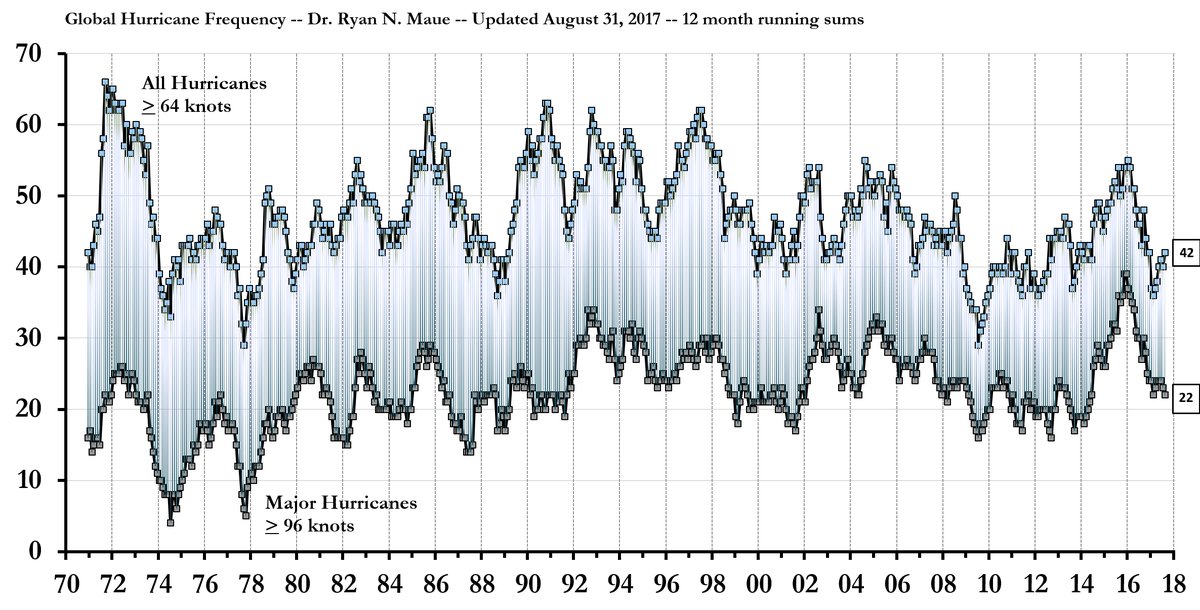 Hurricanes Harvey and Irma have intensified the talk about anthropogenic global warming causing more frequent and powerful hurricanes. But does warming cause more hurricanes? And why was there a nearly 12 year absence of major (Cat 3+) hurricanes making landfall in the USA? Prior to hurricanes Harvey and Irma, the last major hurricane to make USA landfall was Wilma striking Florida on October 24, 2005. Dr. Spencer says that the absence of major hurricane USA landfalls over 11 years should occur only every 560 years, but we should expect 2 category 4 or 5 hurricanes to strike the USA in a single year every 50 years on average. A number of factors need to be just right for a strong hurricane to develop. Hurricanes require a large temperature difference between the sea surface and the cloud tops, but standard global warming theory shows that in a warming world the cloud tops will warm faster than the surface, reducing the temperature difference that powers hurricanes. They also require a pre-existing cyclonic circulation off the African coast, and low wind shear. A paper published September 14, 2017 that used a fine mesh climate simulation designed for tropical cyclone (TC) studies finds that the global frequency of tropical cyclones [hurricanes, cyclones and typhoons] is reduced by 23% in response to a 1.3 °C global temperature rise, while the ratio of intense TC to all TC is increased by only 6.6%. This suggests that the nearly 12 year lull of hurricanes may be credited to our CO2 emissions. This is another benefit of CO2 that is not included in calculations of the social cost/benefit of CO2. The lack of wind shear in the Atlantic this hurricane season has allowed many hurricanes to form and intensify. Hurricane formation is strongly affected by the Atlantic Multi-decadal Oscillation, a natural ocean cycle. The global accumulated cyclone energy shows significant decadal changes but no trends as shown in this graph. The TC frequency had declined significantly since 1992-1998 period, see graph. The Atlantic, Caribbean, and Gulf of Mexico are warm enough every summer and fall to produce major hurricanes. Texas had 11 major hurricane strikes when the sea surface temperature of the Gulf of Mexico was above average and 11 when the temperatures were below average since 1870. The wealth created by fossil fuel use has enabled developed countries to greatly reduce deaths from severe hurricanes. The category 4 Galveston hurricane killed about 8000 people in September, 1900. Harvey and Irma killed 82 and 93, respectively. Stronger buildings, good transportation and communication infrastructure, and warnings have greatly reduced deaths from cyclones. They still cause great devastation and deaths in poor countries such as 138,000 fatalities due to cyclone Nargis in Myanmar (also called Burma) in May, 2008. Heed the warnings and keep safe!