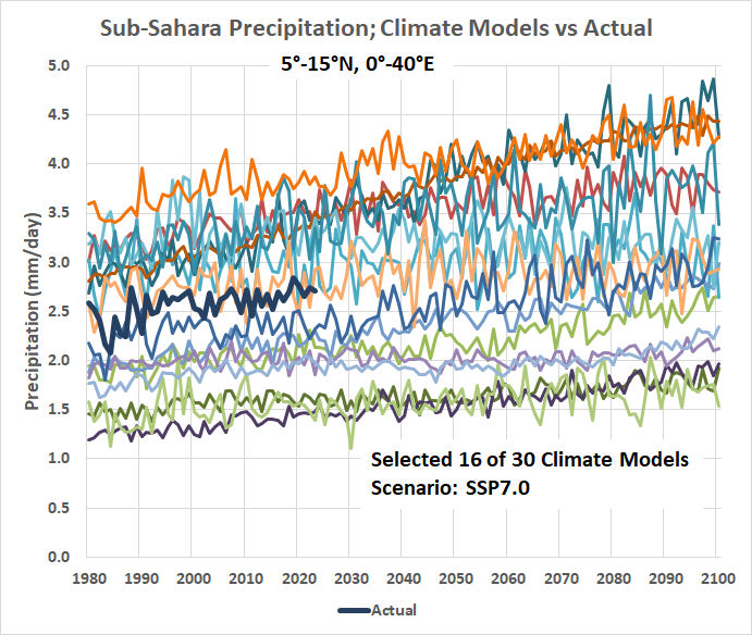 The paper doesn’t show the full range of forecasts so I produced a graph from climate explorer of precipitation forecast of a selection of computer models using the SSP-7.0 scenario as well as the actual precipitation from the U.K. Climate Research Unit (CRU) of the sub-Sahara region from 5° to 15°N. The graph shows that the computer models’ precipitation rates have a huge range of values and rates of precipitation change. In 2023, the last year of the actual data, the climate model’s precipitation ranges from 1.39 mm/day to 3.87 mm/day. The high rate is 280% of the low rate. The CRU measured 2023 rate was 2.7 mm/day. The best fit slope of the 30 available precipitation forecasts from 2023 to 2100 ranges from decreasing at -0.018 mm/day/decade to increasing at 0.148 mm/day/decade.  The graph below shows 16 of the 30 available climate model projections.